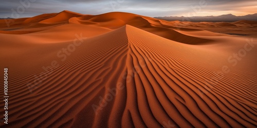 A breathtaking view of red desert sand dunes at sunset, with crisp ridges and soft flowing patterns illuminated by warm golden light, creating a tranquil and expansive natural scene