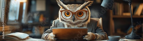 A resourceful owl sitting in a modern office, wearing a suit and looking at a tablet with financial graphs, offering a clear area for text