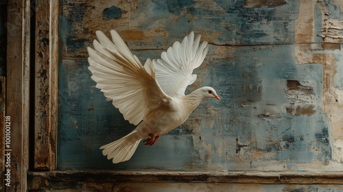 Skrzydlaty gołąb leci w górę, z rozpostartymi skrzydłami, symbolizując Ducha Świętego z Nowego Testamentu.