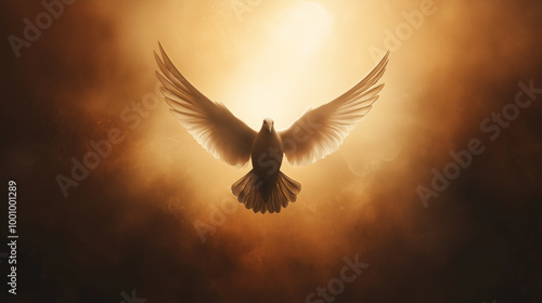 Skrzydlaty gołąb leci w górę, z rozpostartymi skrzydłami, symbolizując Ducha Świętego z Nowego Testamentu.