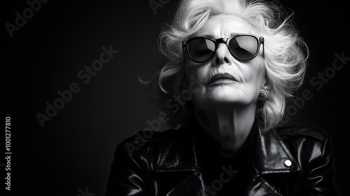 An artistic black-and-white portrait of an older woman with stylish sunglasses and curly hair, exuding confidence and a strong personality.