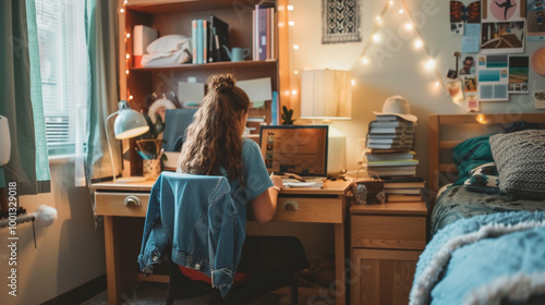 #1343747625Man working on computer in a home office with a wall covered in artwork and plants.