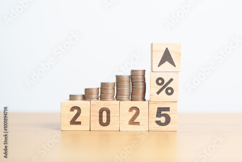 2025 New year with percentage change to UP and Down arrow with coin stack. Interest rate, GDP, stocks market, financial, deflation and Inflation, mortgage, debt, Loan and Economic Recession