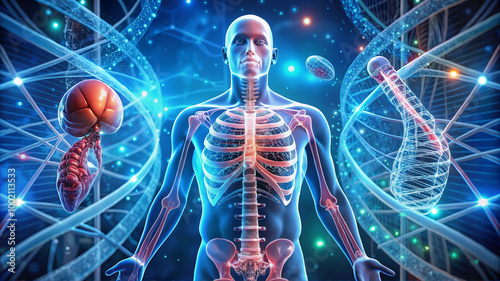Human anatomy illustration with DNA strands, organs, and skeletal structure