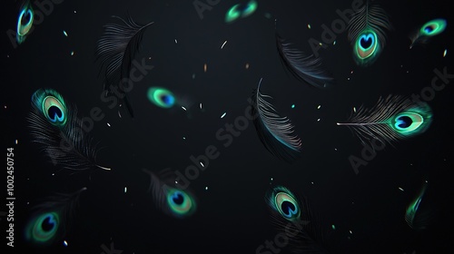 Group of blue and green feathers on a black background with drops of light originating from the central feathers