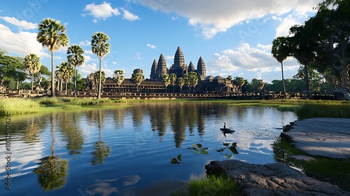 Angkor Wat Temple Reflection in Water Palm Trees Blue Sky Clouds