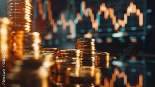 Unas monedas doradas apiladas se ven frente a un gráfico de mercado financiero. La imagen simboliza riqueza, inversión y el crecimiento económico en el contexto de los mercados bursátiles.