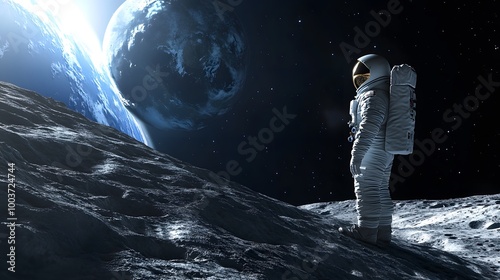 Astronaut Neil Armstrong, spacewalk on the Moon surface watching planet Earth from space.