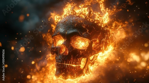 fiery skull with glowing eyes and flaming crown emerges from darkness intricate details in molten metal create an epic otherworldly aura of power and intensity