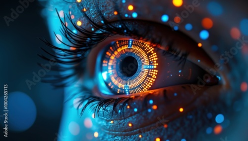 La pupille de cet œil en gros plan, profondément détaillée, semble être une fenêtre vers une autre réalité. Ses nuances vibrantes reflètent l'influence mystérieuse de la matrice.