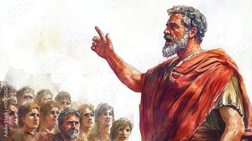 A historical figure passionately addressing a crowd in ancient attire, likely during a philosophical discussion in a classical setting