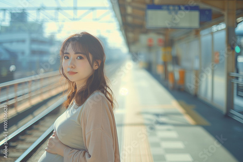 駅のホームに立っているお腹の大きな妊婦「AI生成画像」