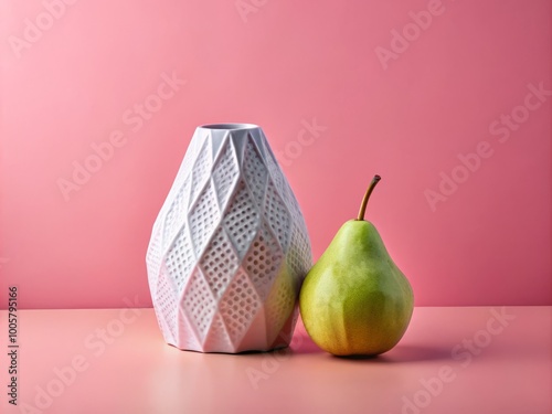 Set against a pink backdrop, a ripe pear sits beautifully in a geometric vase, illustrating a creative minimalist