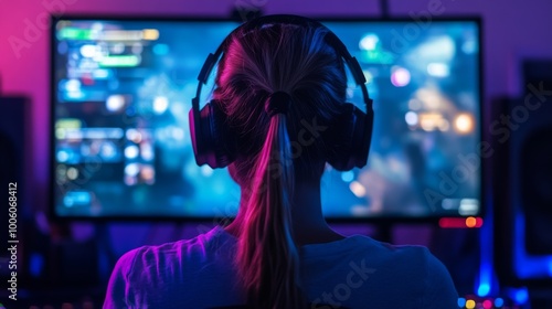 A woman live streaming her competitive esports session, surrounded by her gaming setup with glowing keyboards, dynamic backgrounds, and a chat window full of excited viewers.