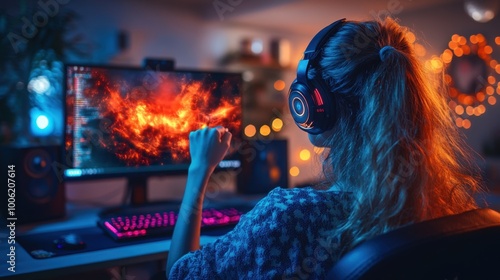woman sitting in a gaming chair wearing headphones and raising a fist in front of a computer setup with an illuminated keyboard and a monitor displaying vibrant fiery graphics
