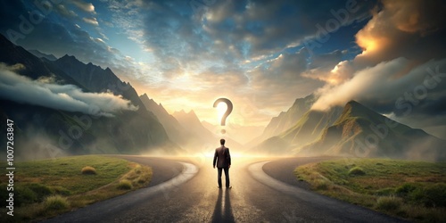 The Uncertain Path Man at a Fork in the Road, Question Mark in the Sky, Misty Mountains, Sunrise, Decision, Uncertainty, Journey