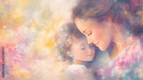 A joyful mother and child sharing a moment of love, surrounded by soft pastel colors, evoking warmth and tenderness for Mother's Day