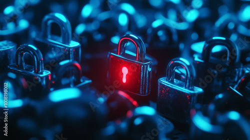 Niebieskie zamki symbolizują różnorodne aspekty cyfrowego bezpieczeństwa. W centrum tej kompozycji znajduje się czerwona, pulsująca latarnia, która przyciąga uwagę i sygnalizuje istnienie problemu.