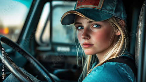 Młoda kobieta kierowca ciężarówki to obraz nowoczesności i przełamywania stereotypów. Z uśmiechem na twarzy, prowadzi swoją maszynę przez malownicze tereny.