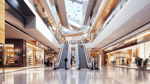 Elegant and Spacious Modern Shopping Mall Interior with Escalators