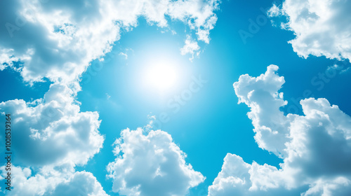 Bezchmurne niebo w odcieniach głębokiego błękitu jest ozdobione puchatymi, białymi chmurami, które delikatnie suną po horyzoncie.