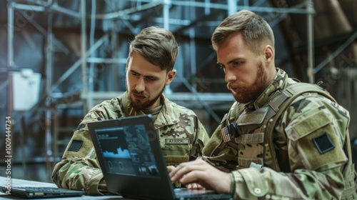 Two men in military uniforms are looking at a laptop