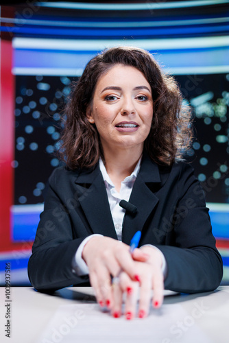Woman broadcaster transmitting live breaking news in media studio, discussing about latest happenings and interesting events. Journalist reading headlines and giving insight to viewers.