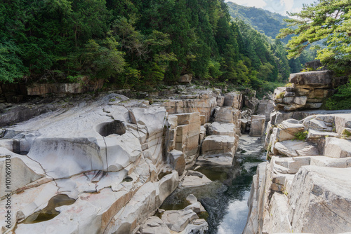 寝覚の床/方状節理と甌穴(石が転がって花崗岩を削った穴)【木曽川】日本長野県
