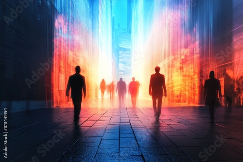Silhouetted figures traverse a futuristic digital corridor bathed in neon red and blue, symbolizing journey and discovery within an advanced cyber realm.
