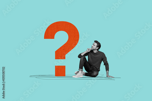 Composite creative art collage of serious man think theory solution question mark ponder brainstorm isolated on painted background