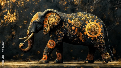 Abstract elephant adorned with golden ornaments, vibrant artistic representation, symbolizing feng shui wealth and prosperity