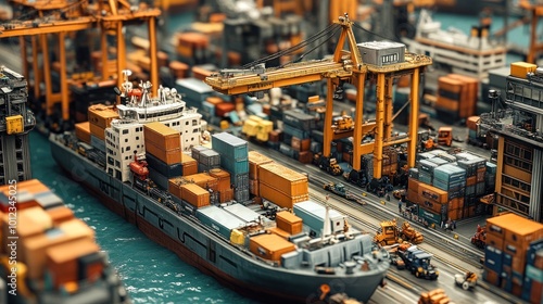 A detailed miniature model of a busy shipping port with cranes, cargo ships, and containers.