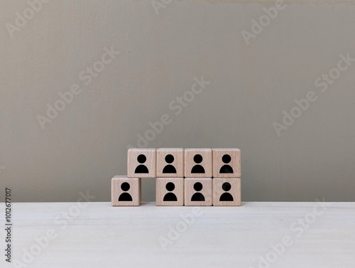 Stacked wooden blocks with person icons illustrate a structured team hierarchy.