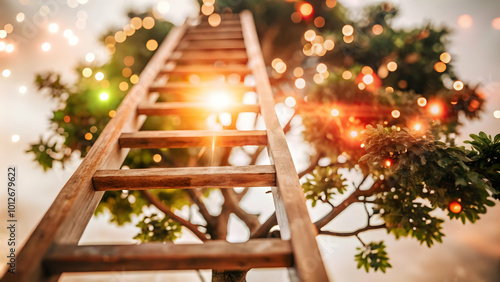 Flat Abstract Ladder Reaching Toward a Tree concept as A soft abstract ladder with bokeh effects reaches toward a glowing tree symbolizing growth through community and compromise in ESG negotiations.