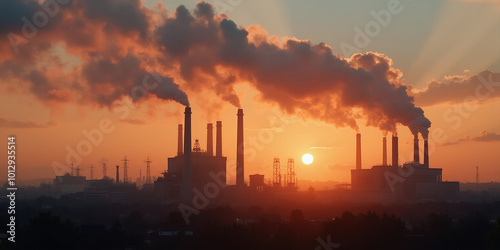 a factory with smokestacks emitting thick clouds of air pollution against a sunset sky