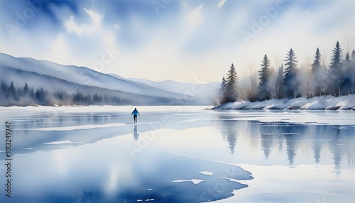 A lonely figure walking thoughtfully on a frozen lake against the background of a misty mountain landscape