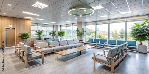 Modern empty hospital waiting room with sleek desk, calm interior design, and comfortable seating, awaiting patients for medical appointments and healthcare services.