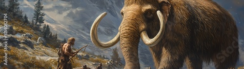 A prehistoric human hunting a woolly mammoth in a rugged landscape, capturing the essence of ancient survival and adventure.