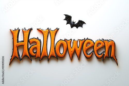 Stylowy napis "Halloween" w pomarańczowych literach z czarnymi obrysami i ozdobnym nietoperzem. Idealny na tła i plakaty na święto duchów.