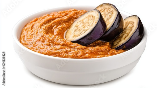 Croatian Ajvar with Eggplant Slices in Bowl Red Pepper and Eggplant Spread White Bowl I