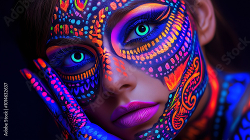 Kobieta o wyjątkowym wyglądzie, na twarzy i dłoniach której widoczne są etniczne wzory, zaaranżowane w jaskrawych neonowych kolorach, które błyszczą w ultrafioletowym świetle.