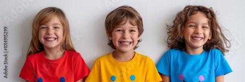 Smiling children in colorful shirts posing for a fun group portrait showcasing friendship and happiness, ideal for educational, promotional, and familyoriented uses