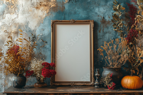 Pusta, złota ramka na tle teksturowanej ściany, otoczona jesiennymi kwiatami, suszonymi liśćmi i dynią. Klimatyczna dekoracja.