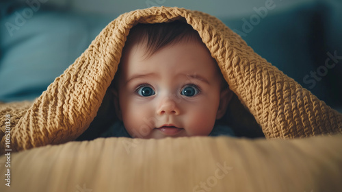 Pod miękkim kocykiem wyłania się urocze dziecko z rozczochranymi włoskami, które z ciekawością spogląda na otoczenie.