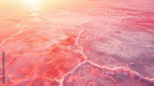 A vibrant pink lake at sunset, with ripples reflecting soft peach and mauve hues against the tranquil surface of the water.