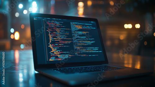 This illustration showcases a laptop computer with lines of code displayed on the screen, representing the software development process.