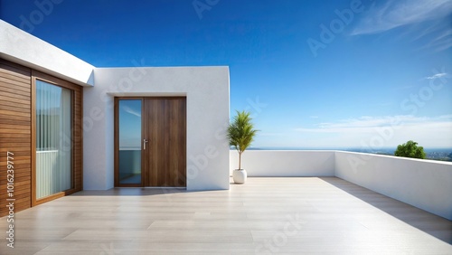 Modern terrace with white wall wooden door, clear blue sky above