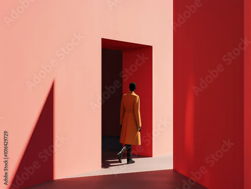 Minimalist scene of a woman in a yellow coat walking through a red doorway, symbolizing transition and new beginnings