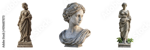 Classical sculptures of Greek and Roman figures ideal for art history illustrations or museum advertisement shown in PNG format with transparent background