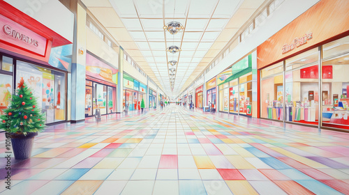 クリスマスツリーと広いショッピングセンター街の風景イラスト